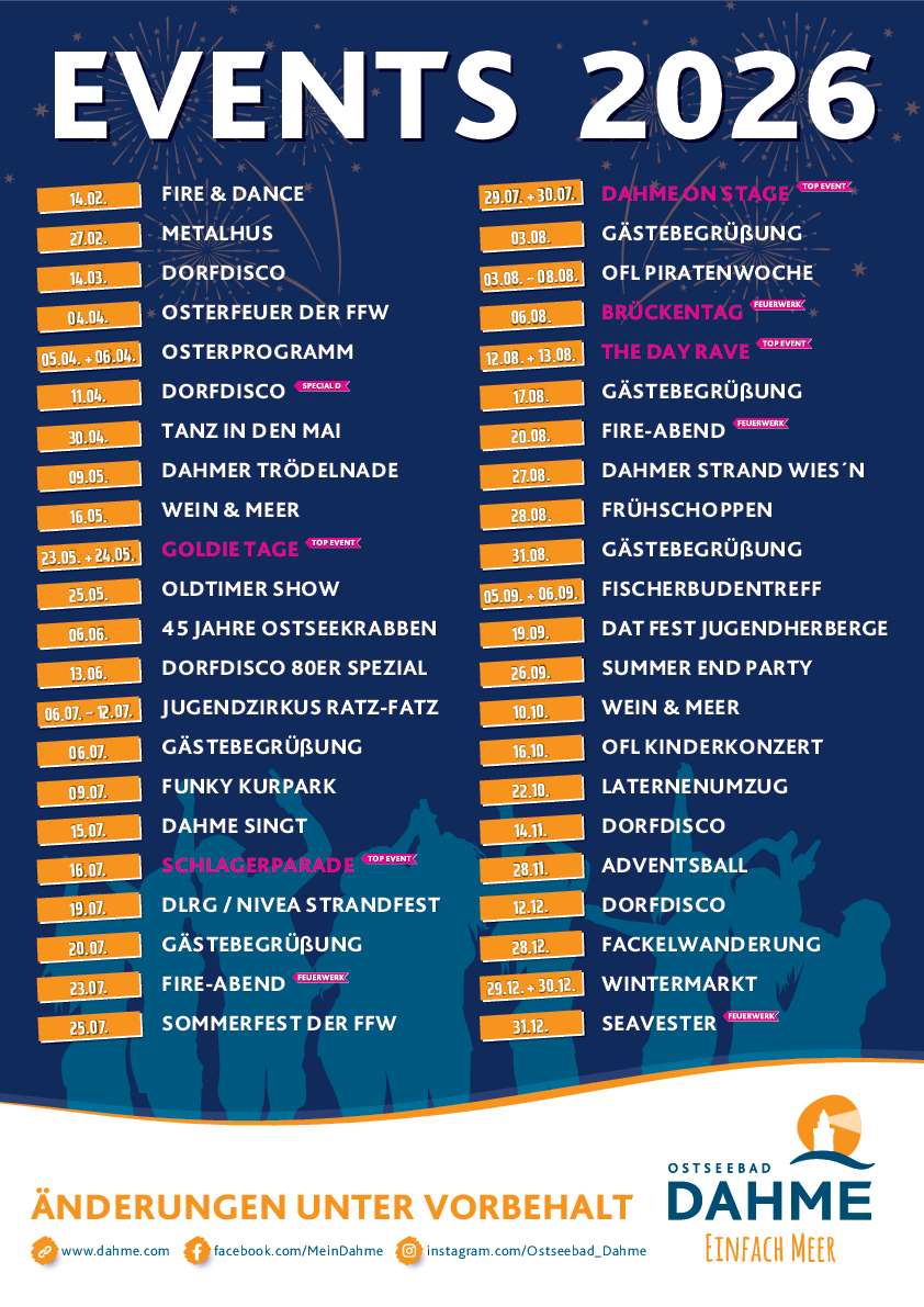 Einfach meer! Direkt an der Lübecker Bucht liegt das Ostseebad Dahme. Lassen Sie sich von unserem fabelhaften Strand verzaubern und genießen Sie den unvergleichlichen Blick aufs offene Meer. Egal ob allein, zu zweit oder mit der ganzen Familie – bei uns gibt es das passende Angebot für Groß und Klein. Wir freuen uns auf Sie!